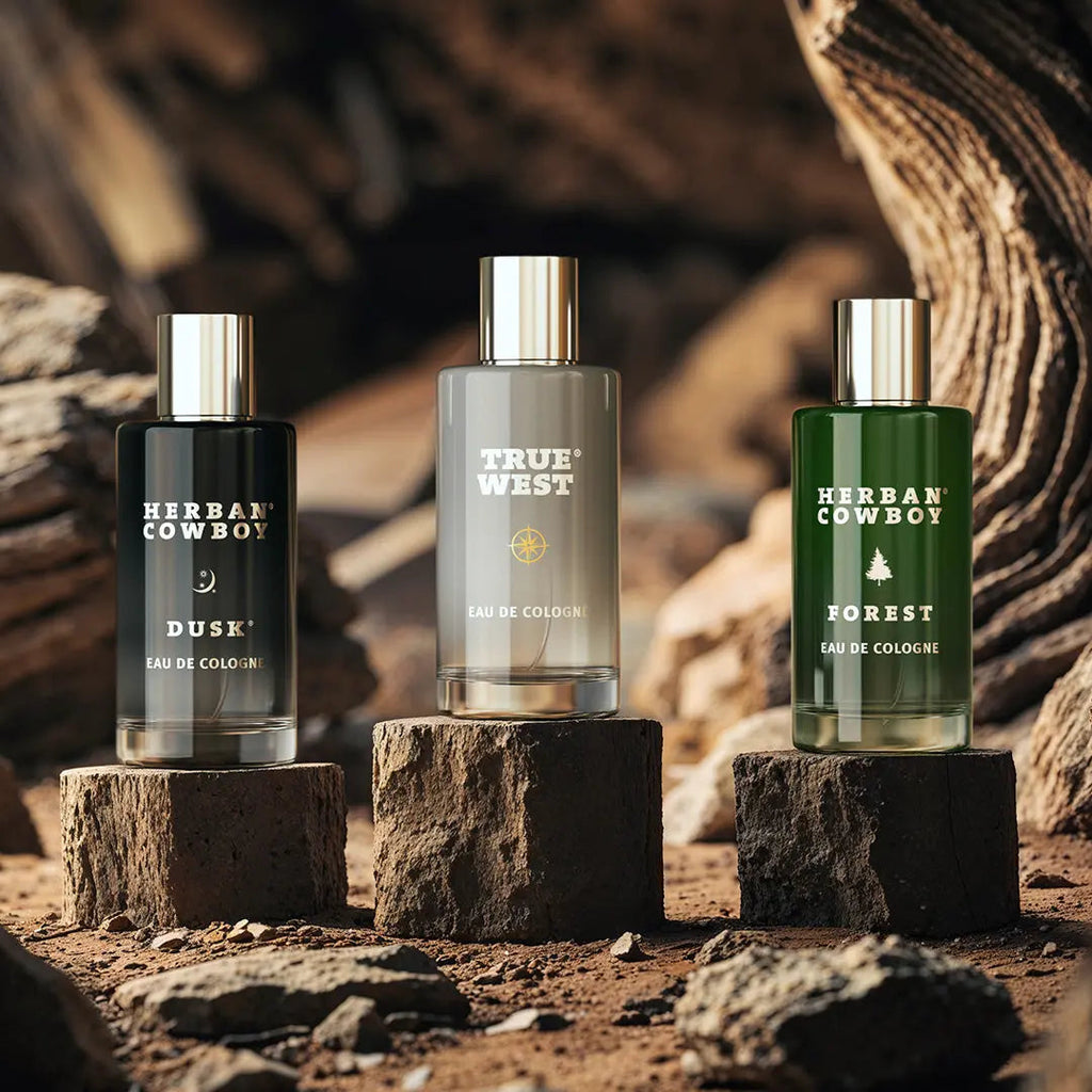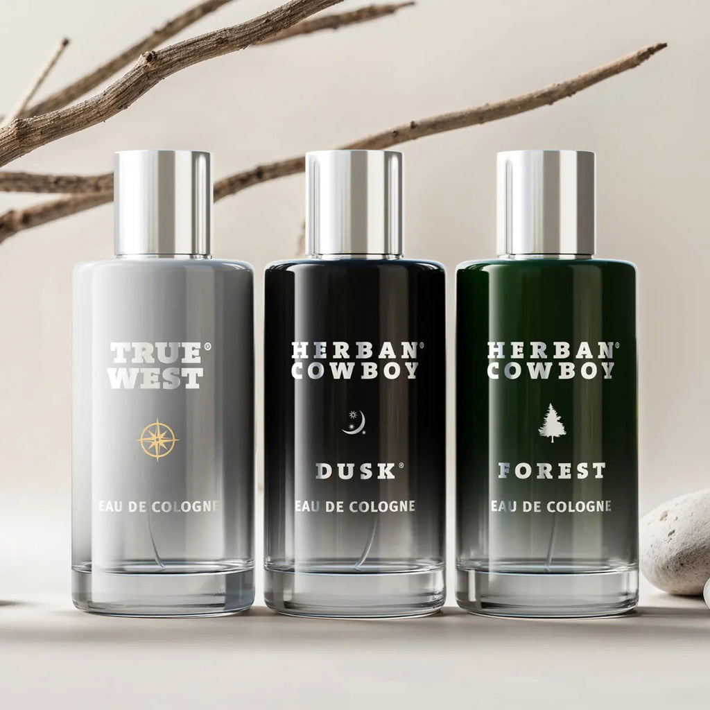 the Herban Cowboy Cologne Trio Set brings together three of the signature scents — True West, Dusk, and Forest — in one rugged collection.
