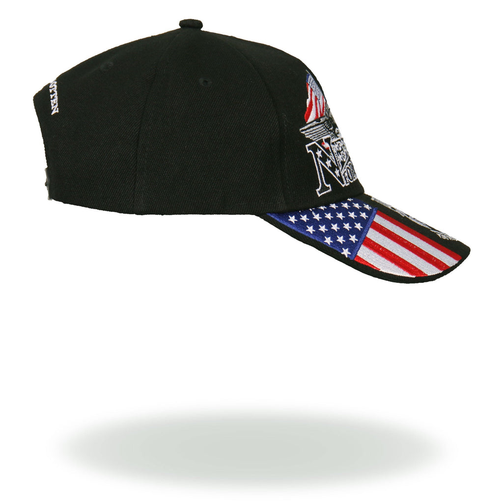 Looking to show your support for our American soldiers? Our signature Iron Eagle POW Ball Cap features an original design on a black cap. The phrase "NEVER FORGOTTEN" is embroidered in white in the center of the cap underneath a bald eagle, crown of stars, American flag, and POW/MIA flag. The bill of the cap has American flags on either side and the POW/MIA emblem in the center, which features the phrase "YOU ARE NOT FORGOTTEN." Wear this ball cap to add patriotism to your biker style.