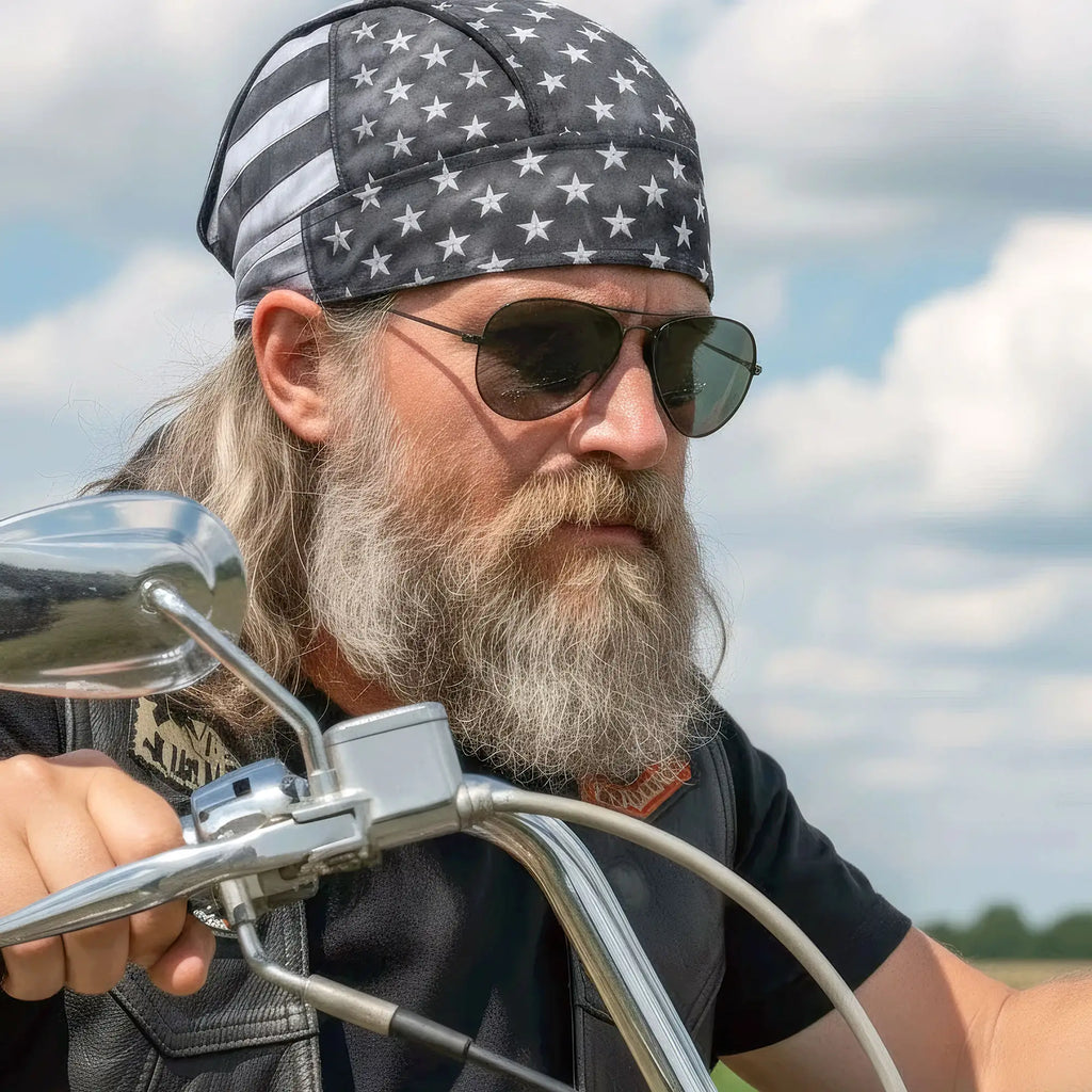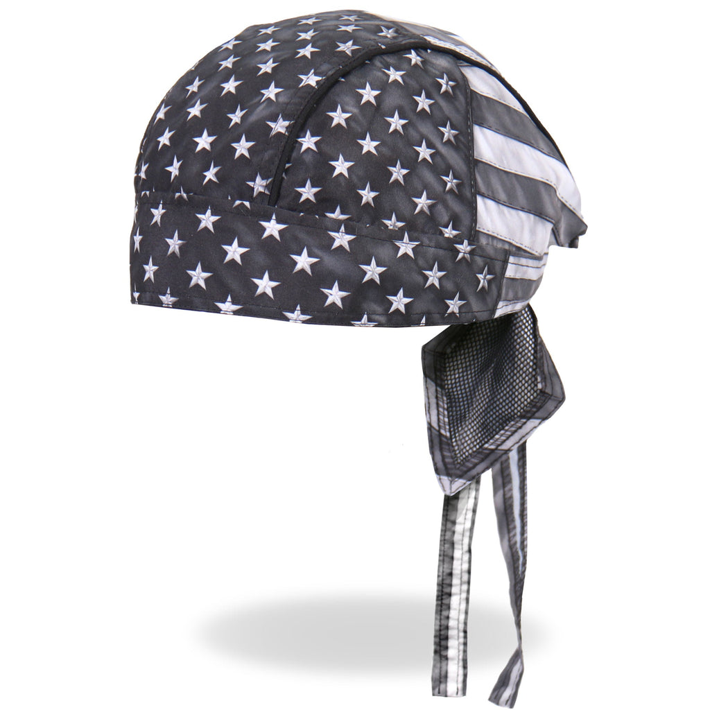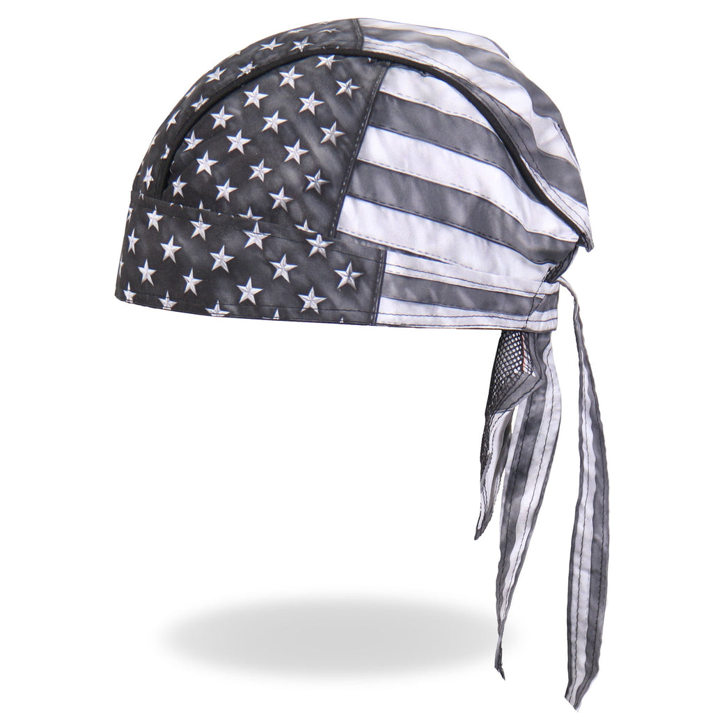 Whether you're hitting the road for a joyride on your motorcycle, getting together with your club, or just need some UV protection and sweat control, Hot Leathers premium doo rag head wraps are just what you need! Put on your new headwrap bandana while you run errands or handle some yard work. Represent your unique style with our moisture wicking, mesh lined head wraps, showcasing bright, long lasting designs sure to turn heads! This head wrap features our original gray American flag vintage style stars and stripes design.