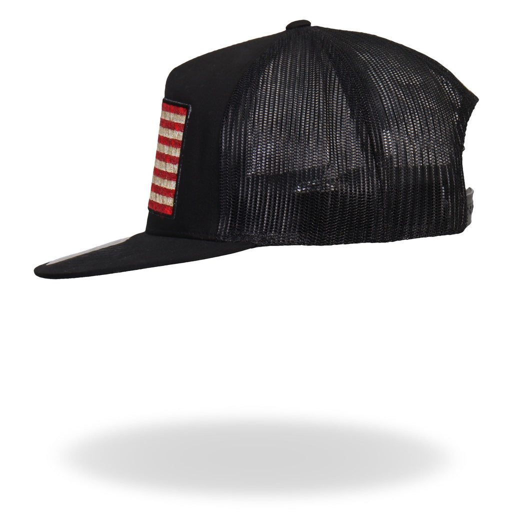 Hot Leathers Snap Back Hat. We use Otto Brand for our hat collection. This is the best snap back flat brim hat in the industry. Its a cotton/polyester blend helps the hat hold its shape for long time use. It is a mesh style back hat with a plastic adjustable tab and features a great Hot Leathers art patch.
