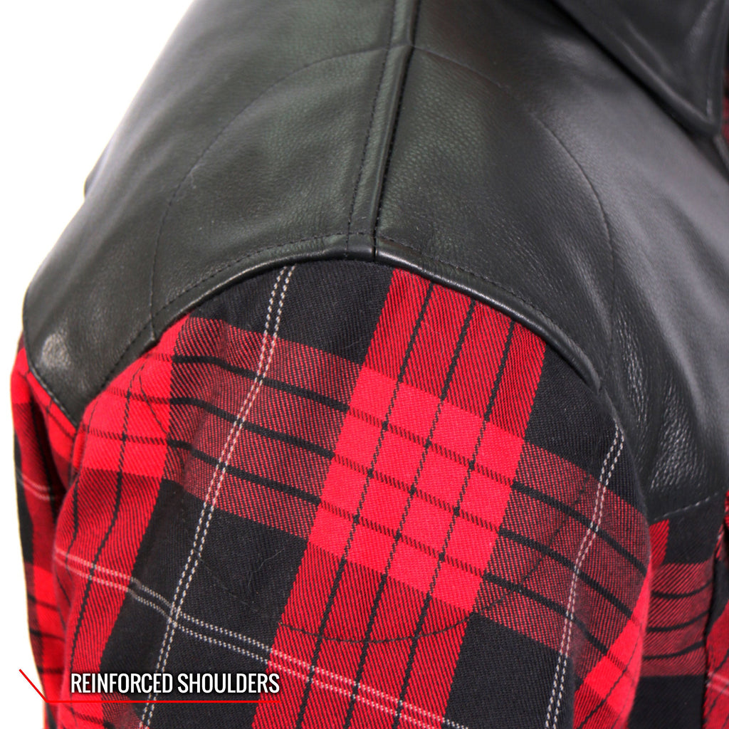 Hot Leathers JKM3201 Men's Motorcycle style Red and Black Reinforced Leather and Plaid Flannel Biker Shirt.