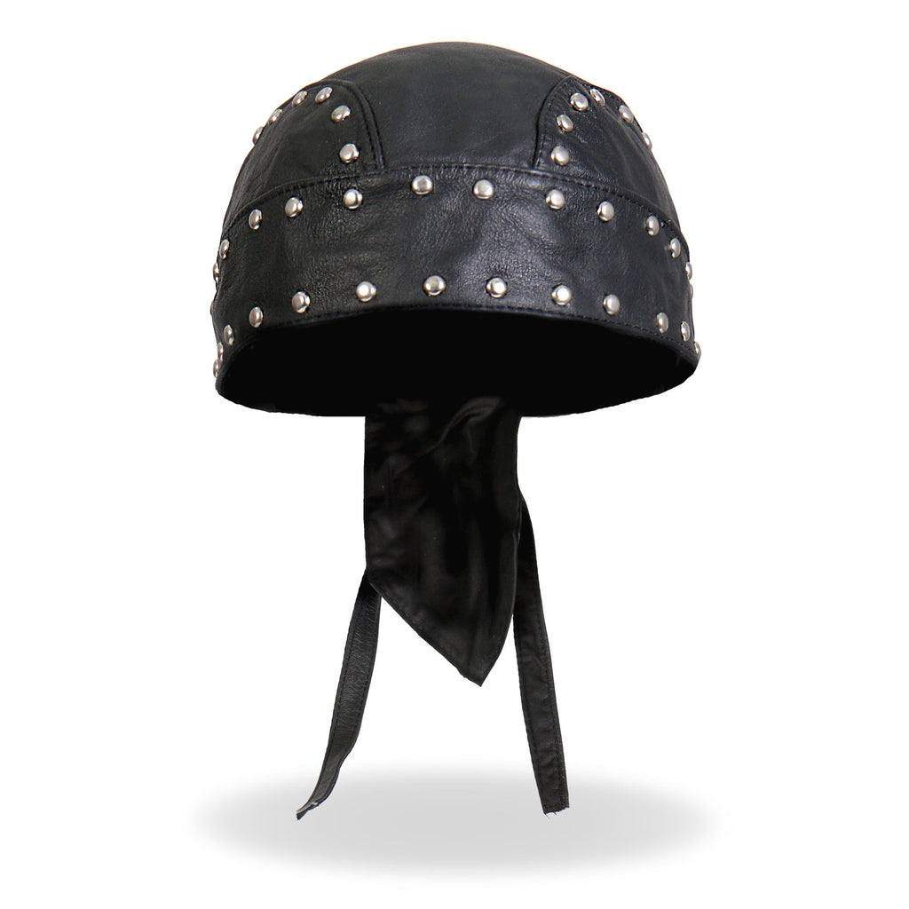 Whether you're hitting the road for a joyride on your motorcycle, getting together with your club, or just need some UV protection and sweat control, Hot Leathers premium doo rag head wraps are just what you need! Put on your new headwrap bandana while you run errands or handle some yard work. Represent your unique style with our moisture wicking, lined head wraps, showcasing bright, long lasting designs sure to turn heads! This head wrap features our original solid black leather and metal stud design.