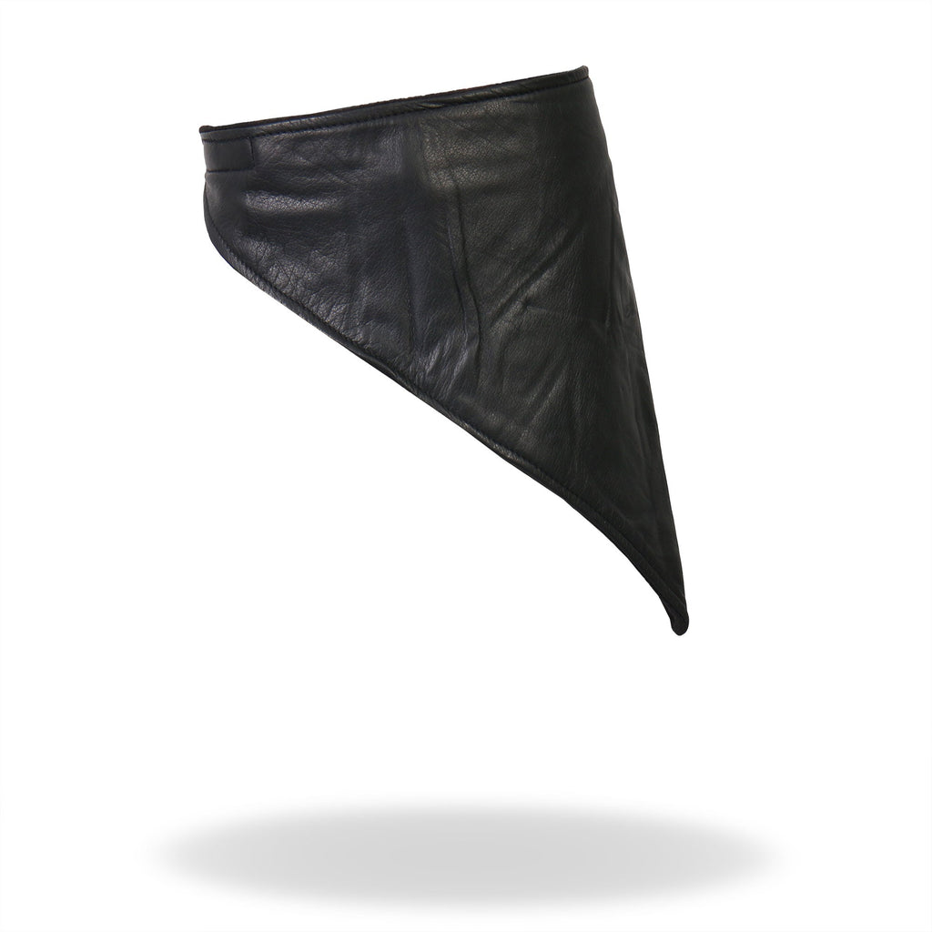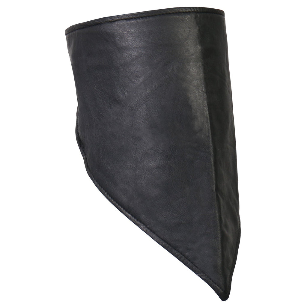 A bandana style, soft black cowhide leather neck warmer with an inner fleece lining, designed to keep you warm and protected during cold weather riding or winter games. Show off your biker style wearing this awesome.