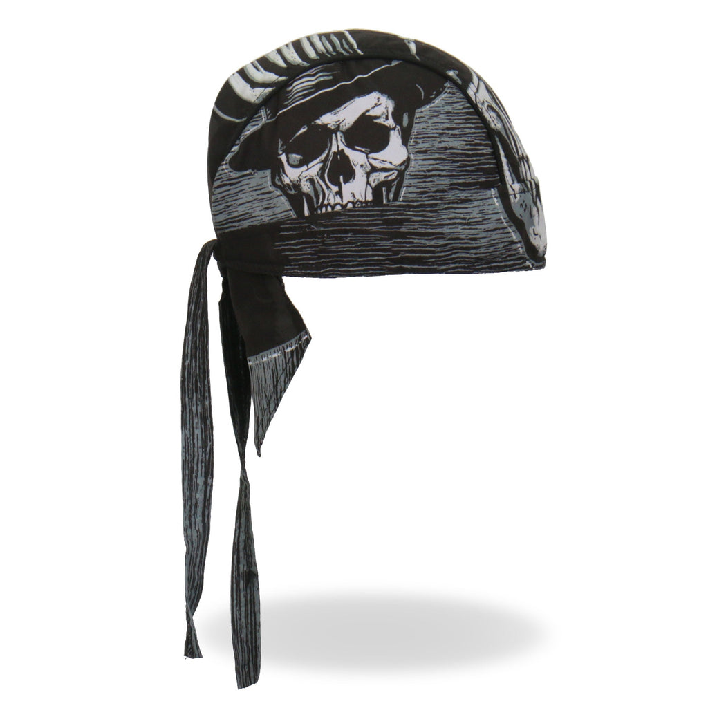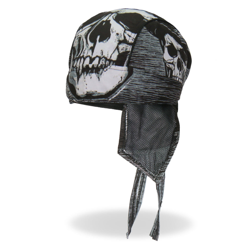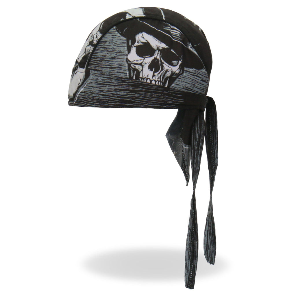 Whether you're hitting the road for a joyride on your motorcycle, getting together with your club, or just need some UV protection and sweat control, Hot Leathers premium doo rag head wraps are just what you need! Put on your new headwrap bandana while you run errands or handle some yard work. Represent your unique style with our moisture wicking, mesh lined head wraps, showcasing bright, long lasting designs sure to turn heads! This head wrap features our original black, white and gray skull and hat design.