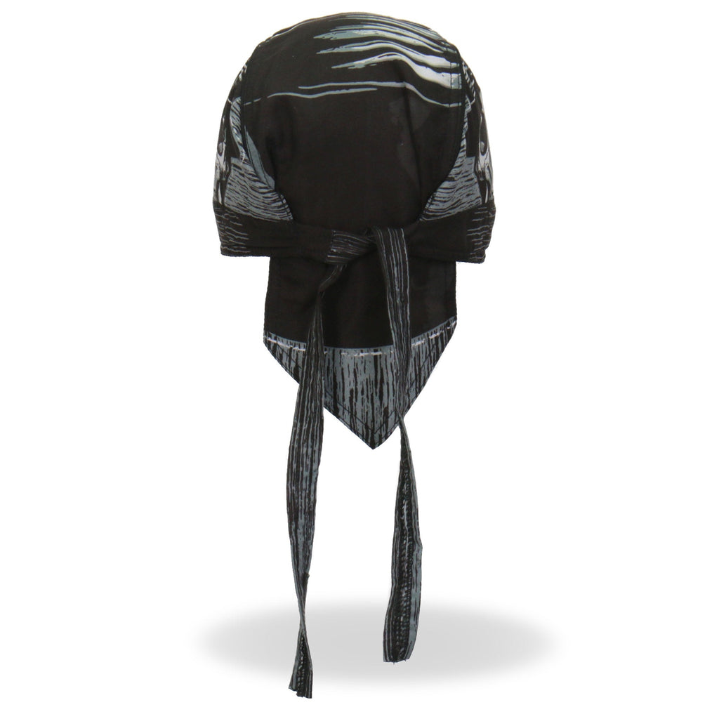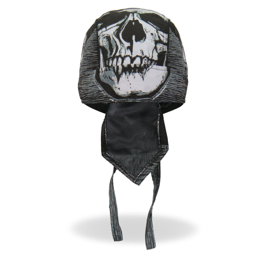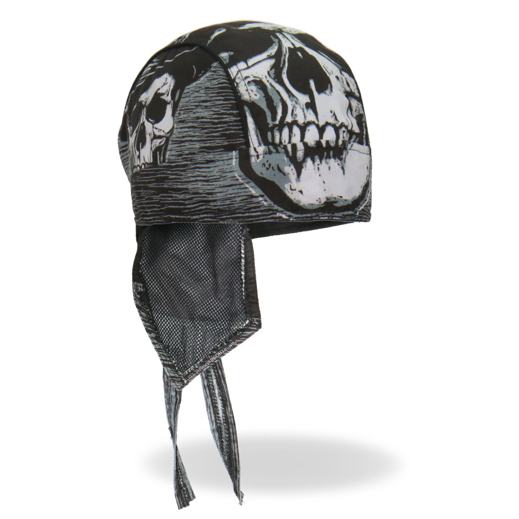 Whether you're hitting the road for a joyride on your motorcycle, getting together with your club, or just need some UV protection and sweat control, Hot Leathers premium doo rag head wraps are just what you need! Put on your new headwrap bandana while you run errands or handle some yard work. Represent your unique style with our moisture wicking, mesh lined head wraps, showcasing bright, long lasting designs sure to turn heads! This head wrap features our original black, white and gray skull and hat design.